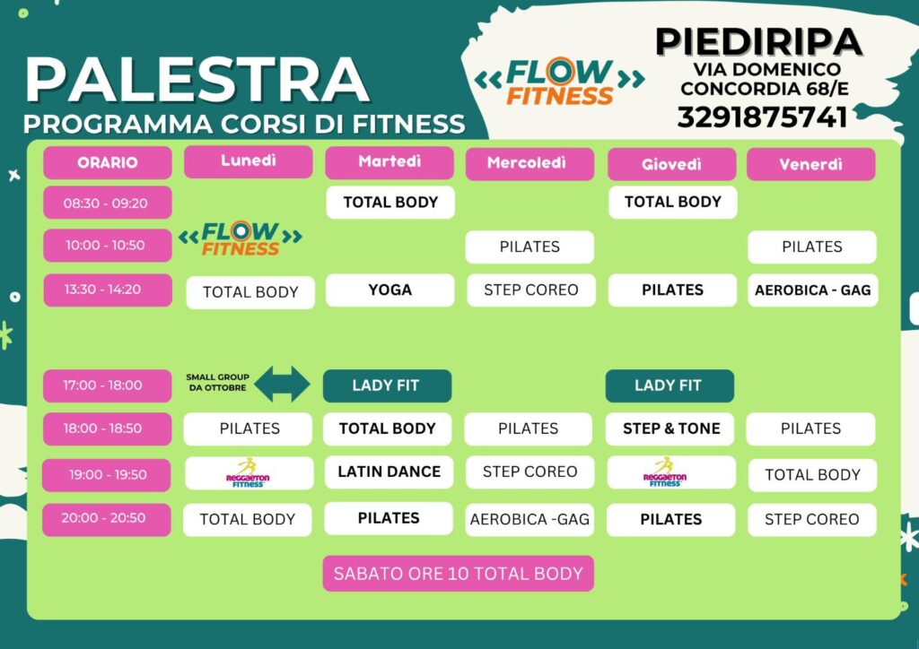 Scopri un mondo di energia, benessere e movimento! Palestra Flow Fitness Piediripa offre dai corsi più dolci come Pilates e Yoga, ideali per ritrovare equilibrio e flessibilità, fino ai più dinamici come Lady Fit e Reggaeton Fitness, perfetti per tonificarti divertendoti. Qualunque sia il tuo livello, troverai il corso giusto per esprimere al meglio la tua forza e la tua vitalità.